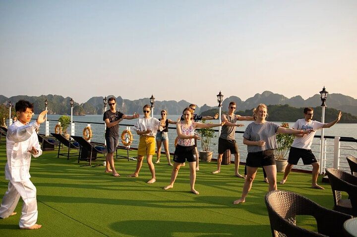 Enjoy a private balcony and stunning views of Ha Long Bay and Lan Ha Bay on this all-inclusive 2-day cruise, with round-trip transfers from Hanoi Old Quarter for maximum convenience. The journey includes all onboard meals, guided excursions such as kayaking, swimming, and rowing boat trips, plus relaxing activities like Tai Chi and a Vietnamese cooking class. This experience combines social interaction during the day with privacy and comfort at night, offering the perfect balance for travelers seeking both adventure and relaxation.
