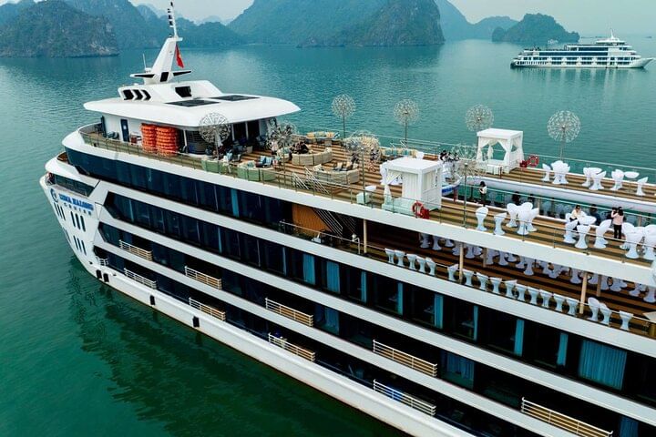 Experience the ultimate in comfort and style with this Ultra Luxury Ha Long Bay Tour from Hanoi, featuring a 5-star cruise experience. Start your journey with a scenic transfer from Hanoi to Ha Long Bay, then board a premium cruise to explore one of Vietnam’s most iconic natural wonders. Sail past majestic limestone islands, relax on the beach at Titov Island, and discover the beauty of Sung Sot Cave—one of the most impressive caves in the world. Savor a gourmet buffet lunch with Asian and European cuisine prepared by professional chefs. Choose to kayak or take a bamboo boat through the peaceful Luon Cave, then unwind with live entertainment on the sundeck as you cruise back to port. Book now for an unforgettable luxury day trip on Ha Long Bay.